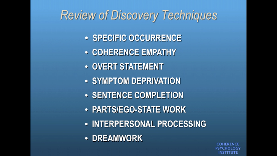 - Eight experiential techniques that bring underlying, implicit emotional learnings into direct, subjective awareness, making them a clear target of change.